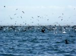 I managed a few photos. All the birds feasting on a baitfish ball, a mother and calf, the mud circle left at the surface by a feeding-snacking whale. Dr. Swartz has an interesting theory about that; we know there is very little food available in the bottom sediment for the gray whales, yet the water is rich in plankton and algae. There is a type of algae that is like cotton in texture. Dr. Swartz thinks it gets stuck on the whales’ baleen, so maybe they are taking mouthfuls of sand and sediment to clean their baleen!