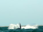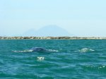 The next photo is what I got of a mating group. An unusual pattern and tip missing, probably survived an Orca attack. A photo of the back of a juvenile whale and the Tres Virgines, active volcanoes (there is a geothermal plant up there!), in the background. And the splash down of a breach!