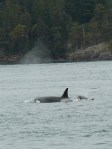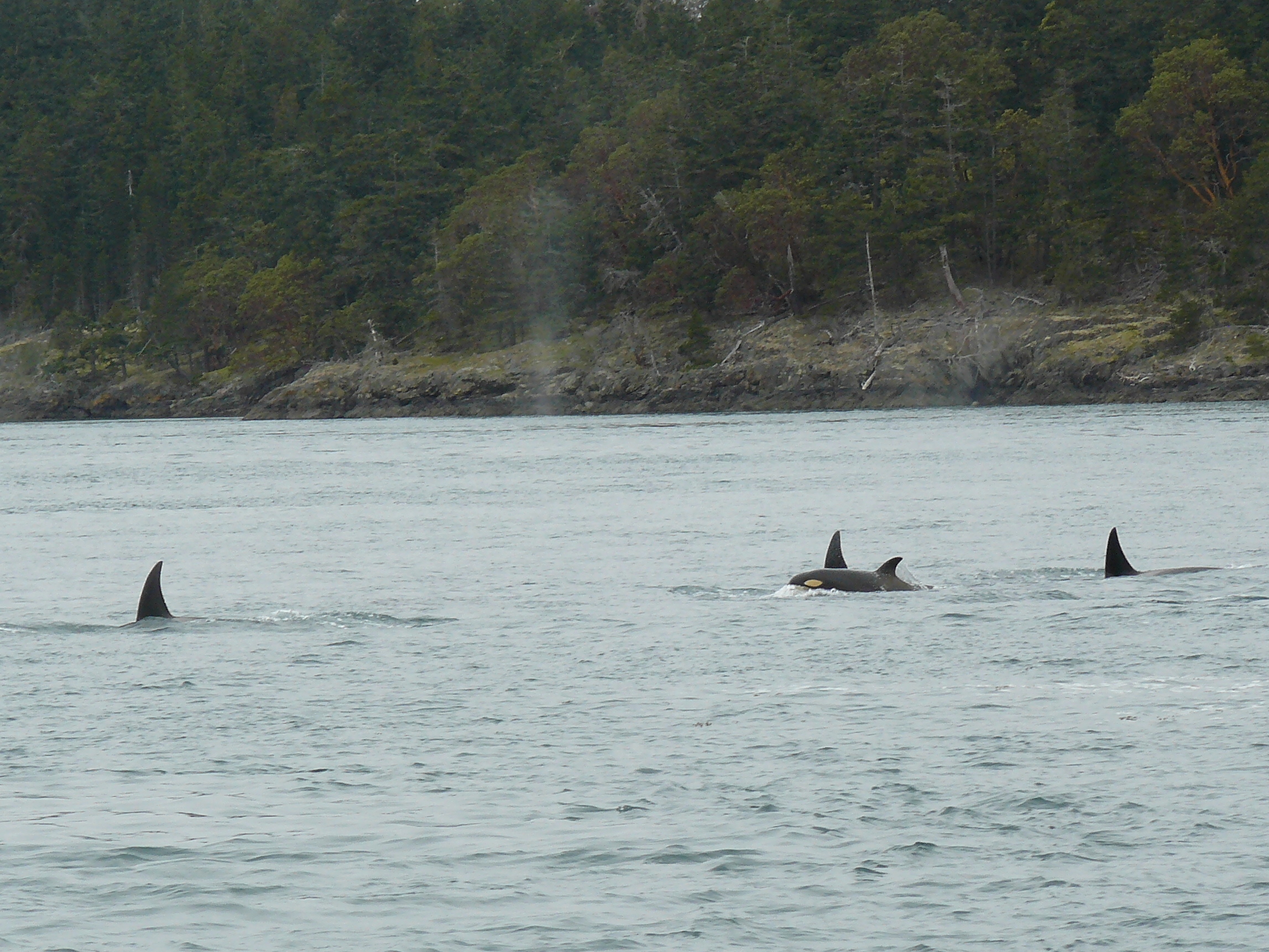 We saw at least 6 Orcas by Lopez Island, coming up San Juan Channel with the flooding tide, starting at about 12:20pm. They were in 2 groups appearing to be feeding as many gulls were with them for leftovers. It looked like 2 families, 2 adult females with their offspring. Able to indentify T-049B with her 5 year old calf T049B1, and it looked like she had a new calf- we could see the yellow tint of the little calf’s’ white eye patches and chin!