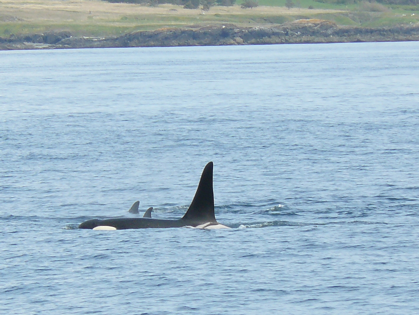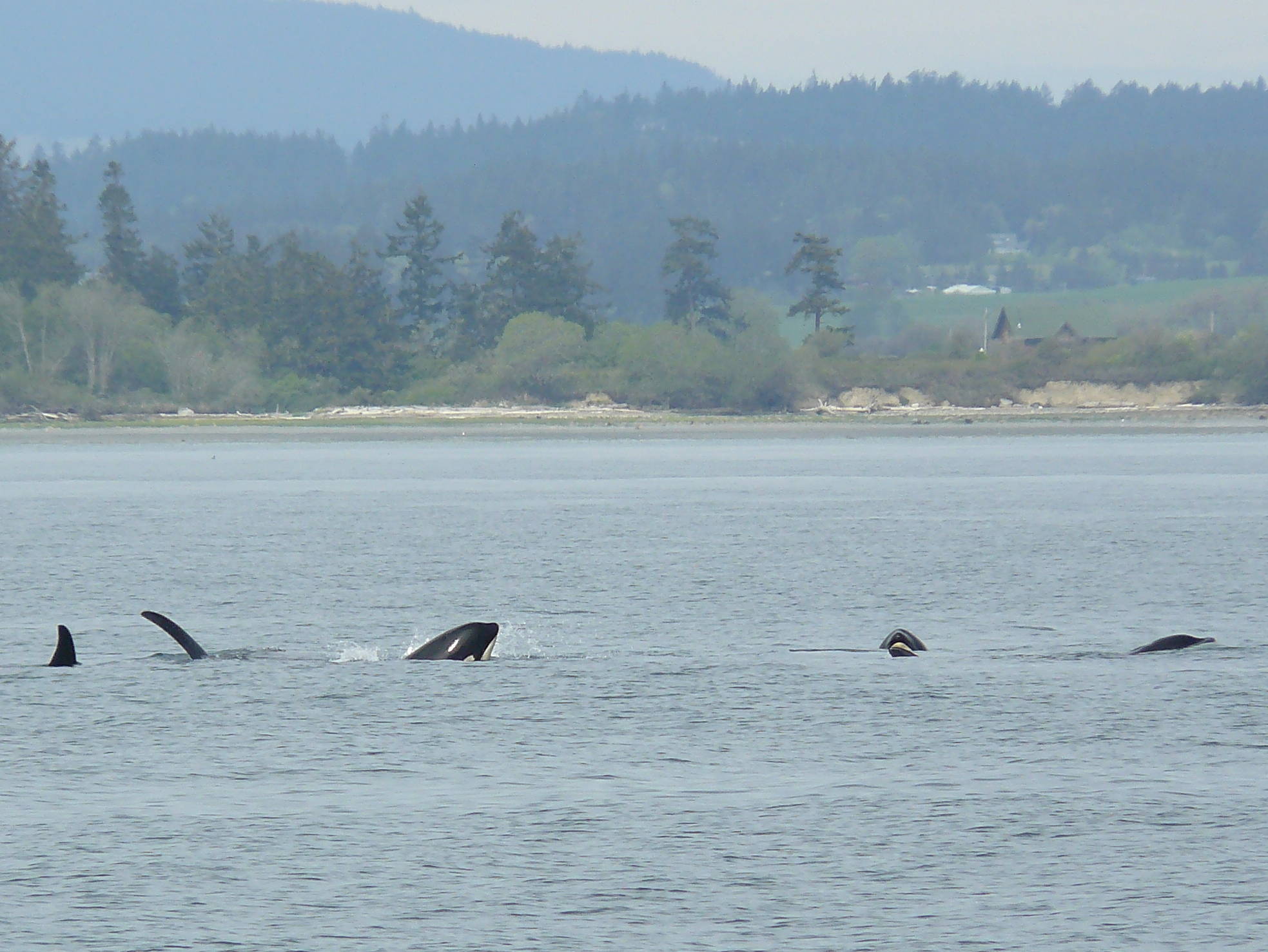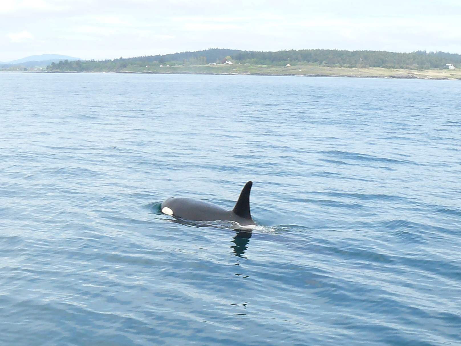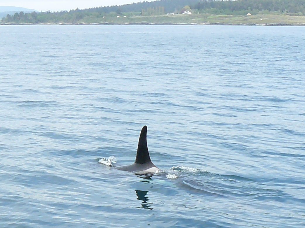 Starting out north on a nice, calm, sunny afternoon, no whale reports. Then, then! a rumor of Orcas in the Strait of Juan de Fuca, heading in east! So we turned around, headed south and west, and started seeing killer whale fins off of False Bay and San Juan Island, swimming against an ebbing tide.