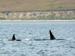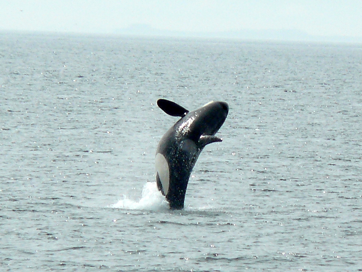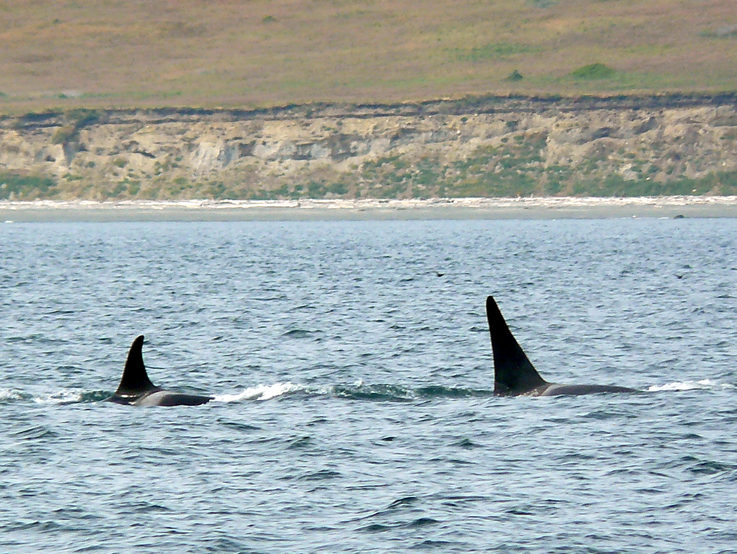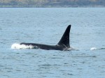 J-Pod Orcas in the Strait of Juan de Fuca, heading northwest from Whidbey and Smith Island toward Lopez and Salmon Bank with calm, flooding tide. At 2:50pm, I noticed J-34 DoubleStuf by himself, and many small groups really spread out. One whale breached closer to South Beach, then many whales breached all over the place! I lost count of how many breached! A calf stuck its little head up as though trying to spy hop! Some tail lobs and whales rolling around showed active behaviors! The groups came closer together as they reached Salmon Bank, slowed down swimming toward Eagle Cove, as they often do. The sun reflected off their backs, and we give them lots of room when they are spread out like that, so hard to identify. We enjoyed watching all the active behaviors until about 4:15pm and were able to ID that last group; J-16 Slick with her daughters J-36 Alki & J-42 cute little Echo, and my personal favorite- her son J-26 Mike.