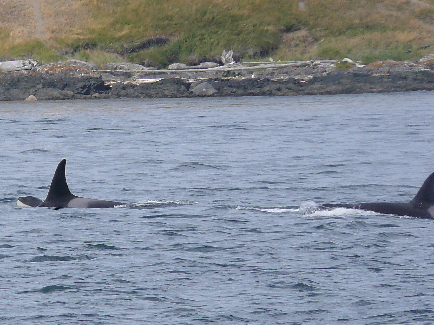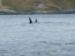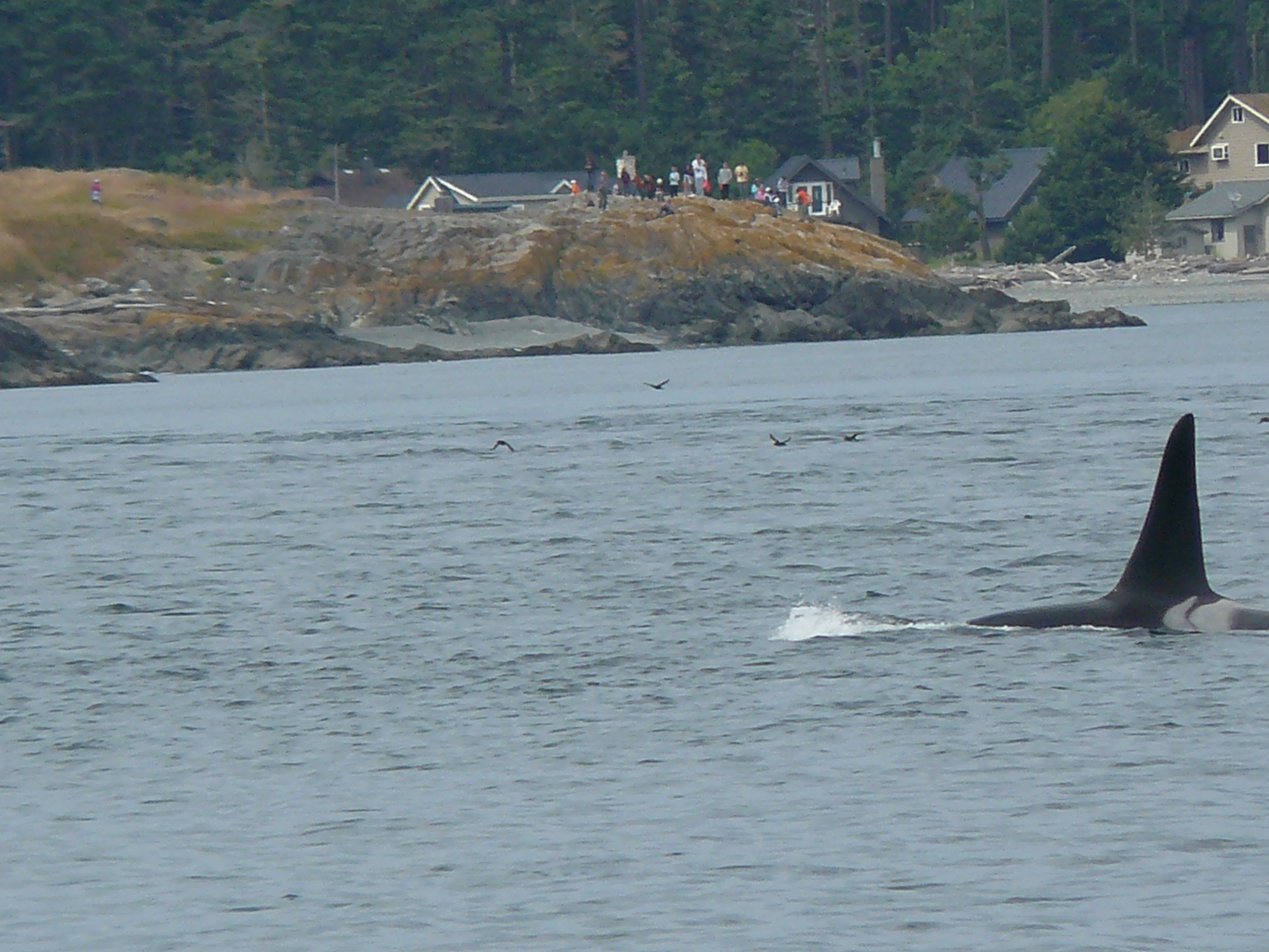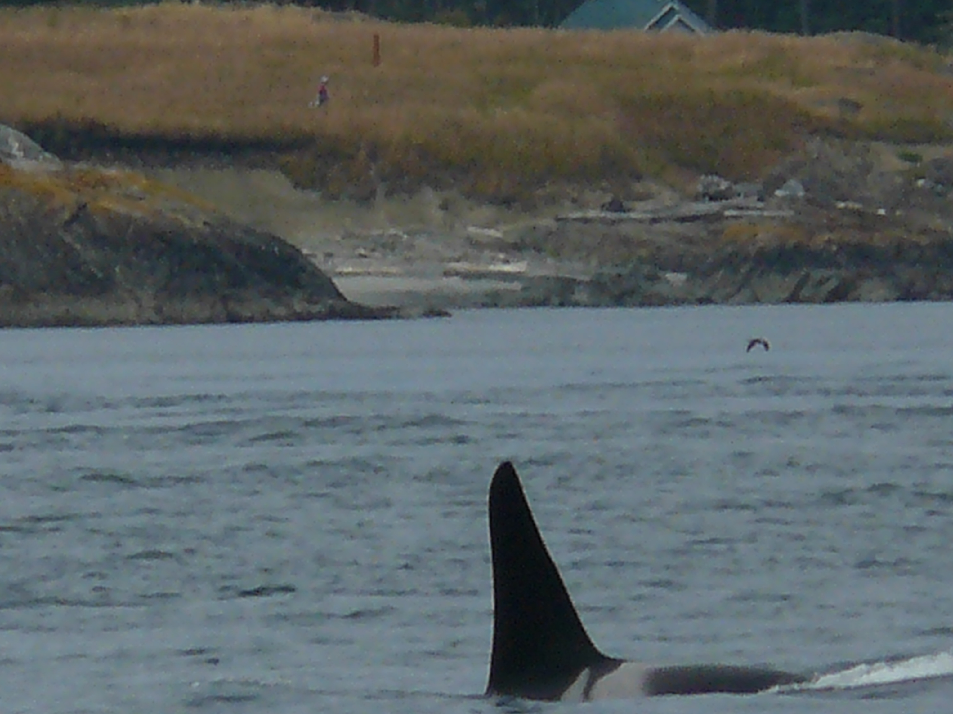 Heard reports of Orca Whales by Anacortes at 9am, then in Rosario around 1pm, then heading west, south of Lopez at 2pm, in the Strait of Juan de Fuca, where we watched groups of J-Pod going by Cattle Pass at about 2:45pm! They slowed down as they hit Salmon Bank, as they typically do, spreading out, milling about, tail fluke slapping, rolling, and foraging in the strong 10+ flooding tide. Young whales breached passing Cattle Point Lighthouse! Mom-calf pairs stayed closer to shore, as they often do. I ID’d J-27 Blackberry, J-31 Tsuchi, J-22 Oreo and her kids J-38 Cookie and J-34 DoubleStuf, J-28 Polaris with 2 year old daughter J-46 Star. We thought we spotted J-26 Mike, by his left leaning dorsal fin, up with a group off of Granny’s Cove. The sun came in and out, the water was like a pond. Now 4:15pm, a juvenile Minke whale (Christy Hynde-Bank’s calf?? Minke calves spend about 6 months with mom) foraging by Salmon Bank! I wonder if the Minke socialized with J-Pod, like the one did last season? Marine birds, Bald Eagles on Long Island, Harbor Seals and Harbor Porpoise in San Juan Channel, showed all the ‘stars’ of the Salish Sea!