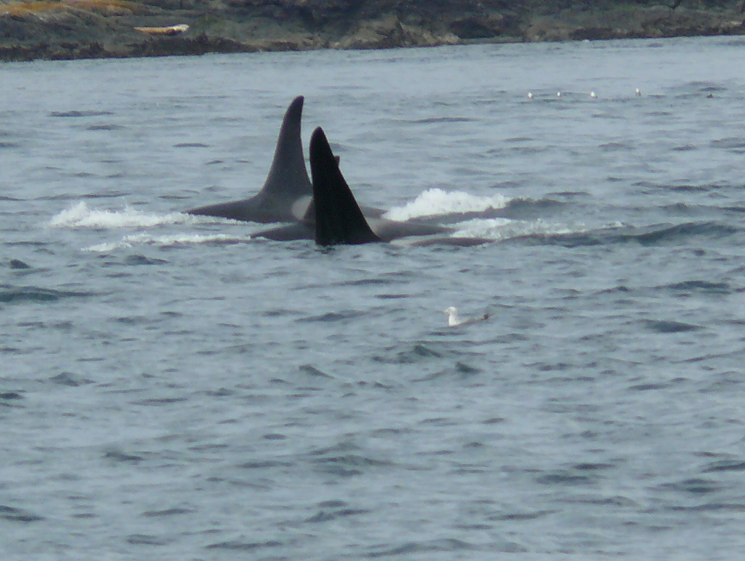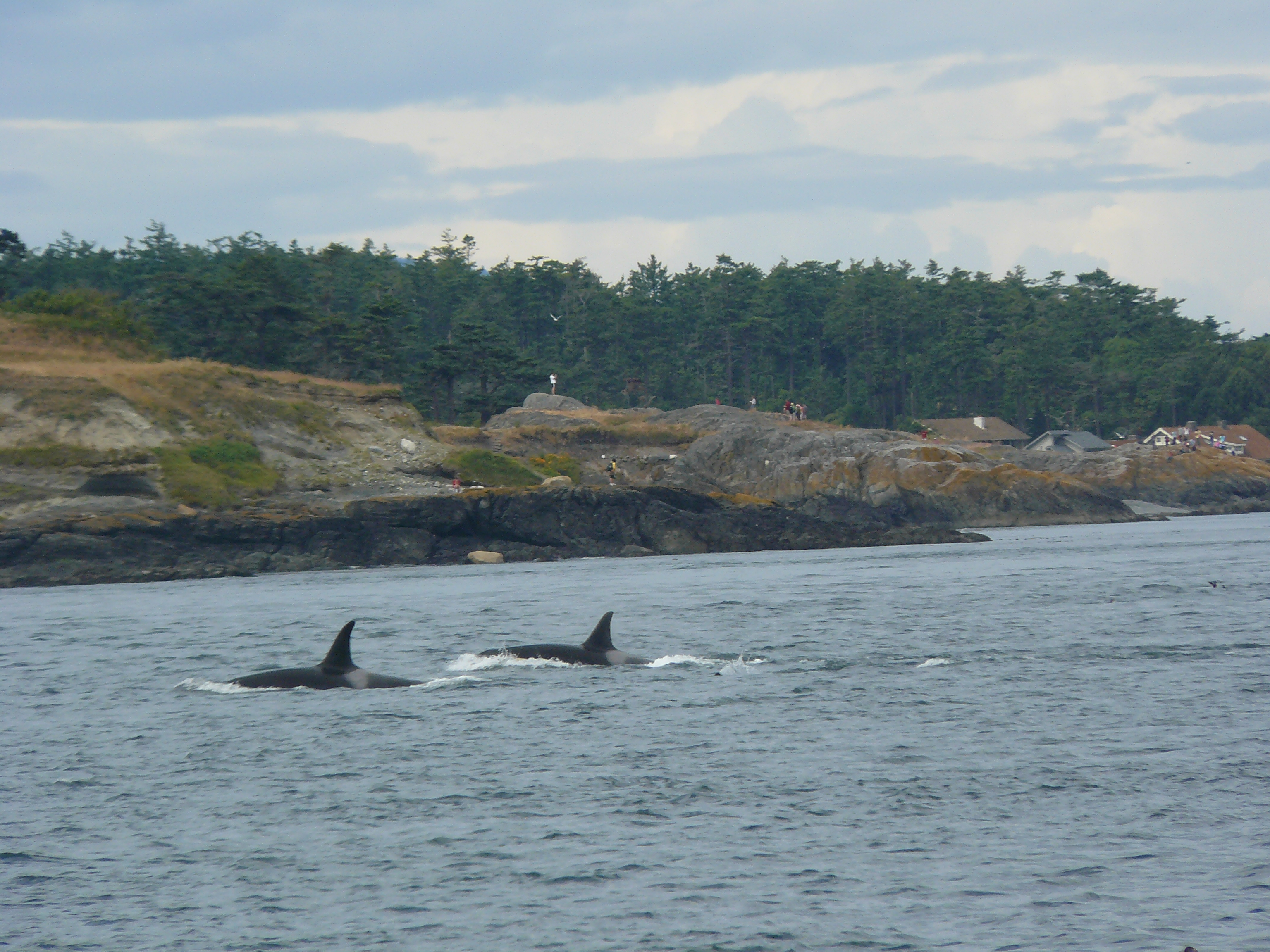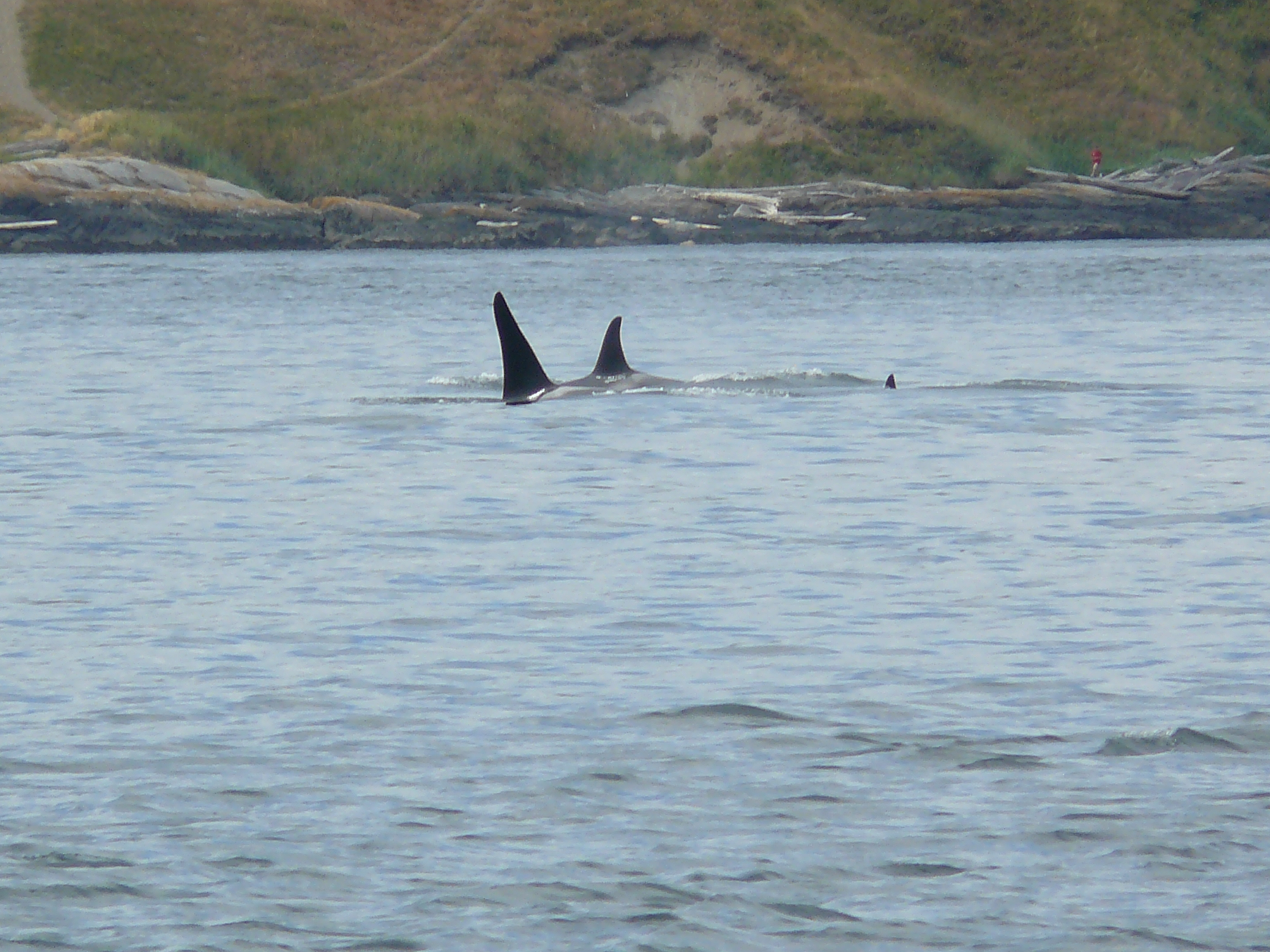 Heard reports of Orca Whales by Anacortes at 9am, then in Rosario around 1pm, then heading west, south of Lopez at 2pm, in the Strait of Juan de Fuca, where we watched groups of J-Pod going by Cattle Pass at about 2:45pm! They slowed down as they hit Salmon Bank, as they typically do, spreading out, milling about, tail fluke slapping, rolling, and foraging in the strong 10+ flooding tide. Young whales breached passing Cattle Point Lighthouse! Mom-calf pairs stayed closer to shore, as they often do. I ID’d J-27 Blackberry, J-31 Tsuchi, J-22 Oreo and her kids J-38 Cookie and J-34 DoubleStuf, J-28 Polaris with 2 year old daughter J-46 Star. We thought we spotted J-26 Mike, by his left leaning dorsal fin, up with a group off of Granny’s Cove. The sun came in and out, the water was like a pond. Now 4:15pm, a juvenile Minke whale (Christy Hynde-Bank’s calf?? Minke calves spend about 6 months with mom) foraging by Salmon Bank! I wonder if the Minke socialized with J-Pod, like the one did last season? Marine birds, Bald Eagles on Long Island, Harbor Seals and Harbor Porpoise in San Juan Channel, showed all the ‘stars’ of the Salish Sea!