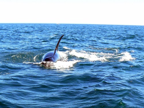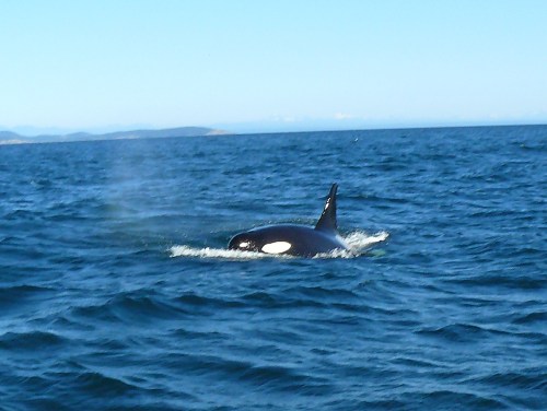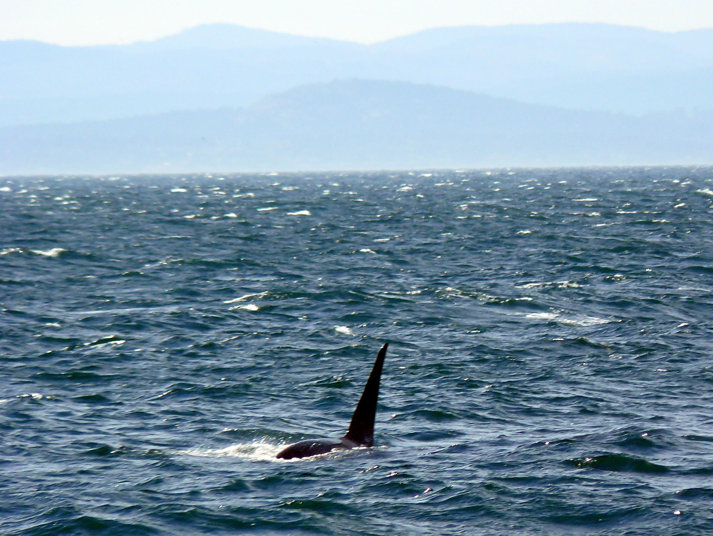A sunny yet windy summer day! The Strait of Juan de Fuca bumpy this afternoon, (when I was a child crossing the strait, I called it the ‘strait of I wanna puka’!). A fairly strong flooding tide and wind stirred up choppy water. The passengers, a few seasick, a few wet from catching a rogue wave out on the bow, were great adventurers, rewarded seeing L-Podders west of Salmon Bank from about 3:20pm to 4pm. The Orcas were spread out in small groups, with a group of 3 most visible to us, seeming to mill about, many direction changes hunting for salmon in the rock and roll conditions. The 3 whales dove about 400 yards away from us, then several minutes later surfaced by our port side! L-53 Lulu, L-95 Nigel, and L-85 Mystery all swam under the boat! Interesting that all these orphans, (34, 16, and 20 years old), were traveling together.