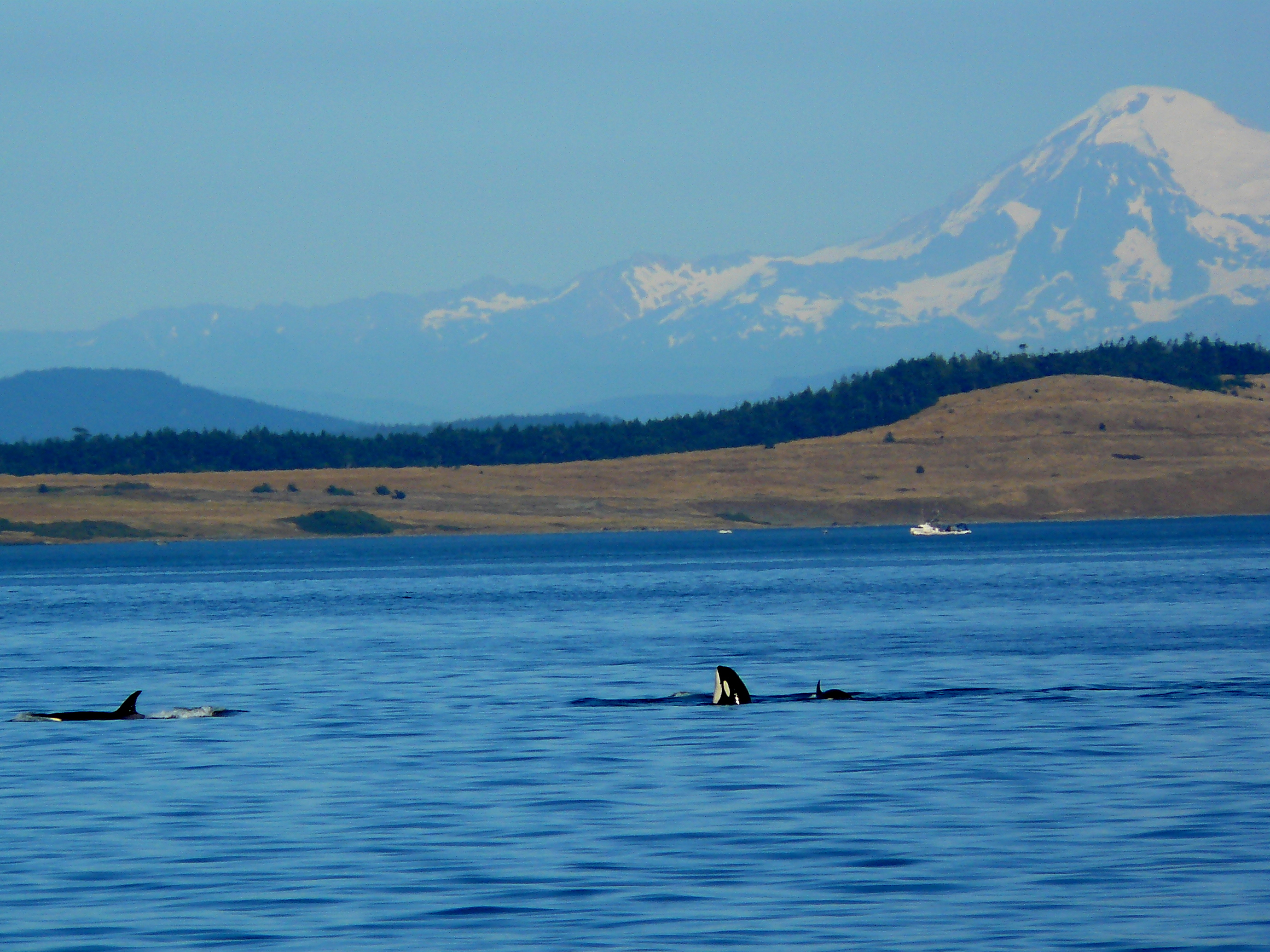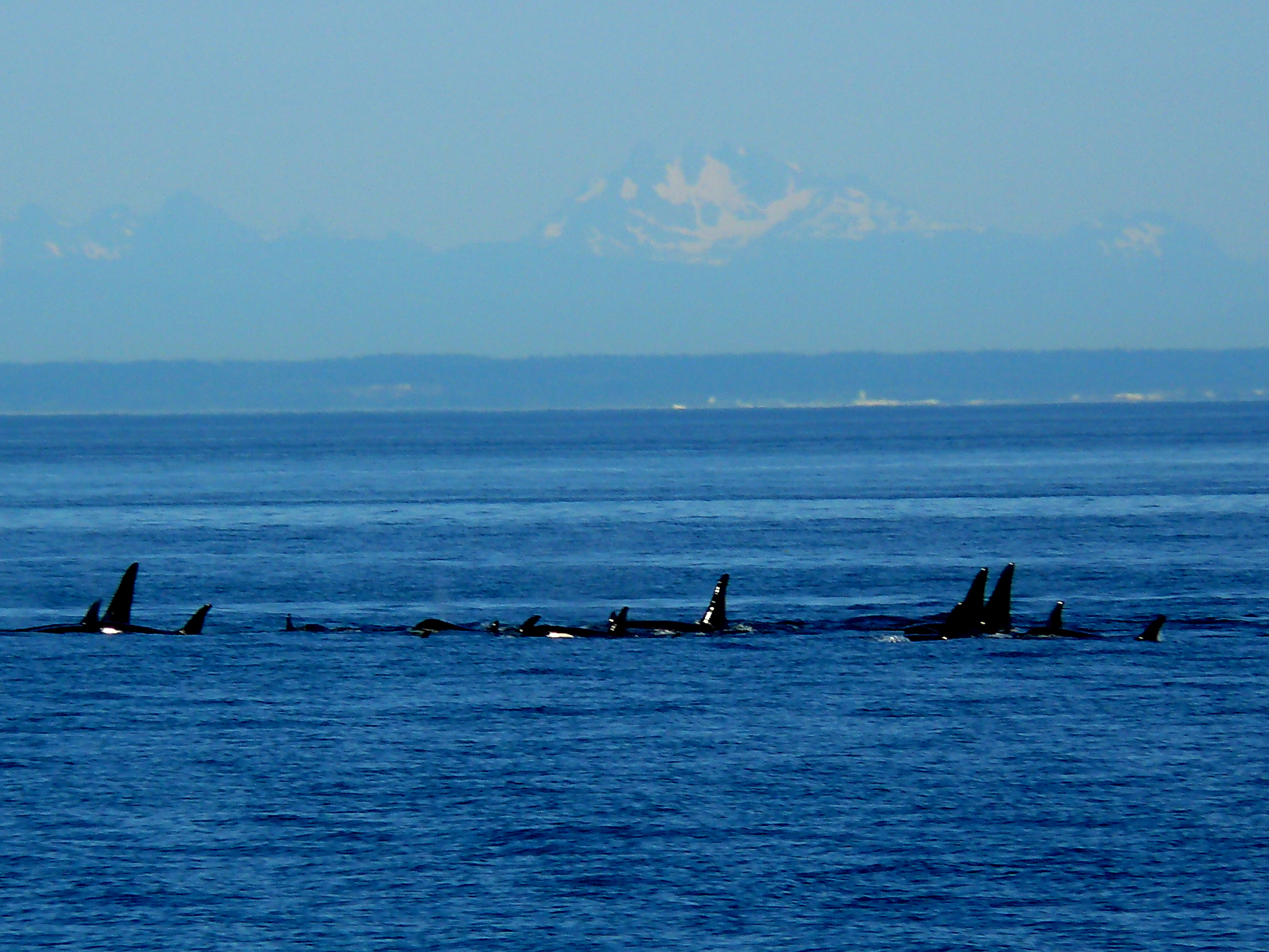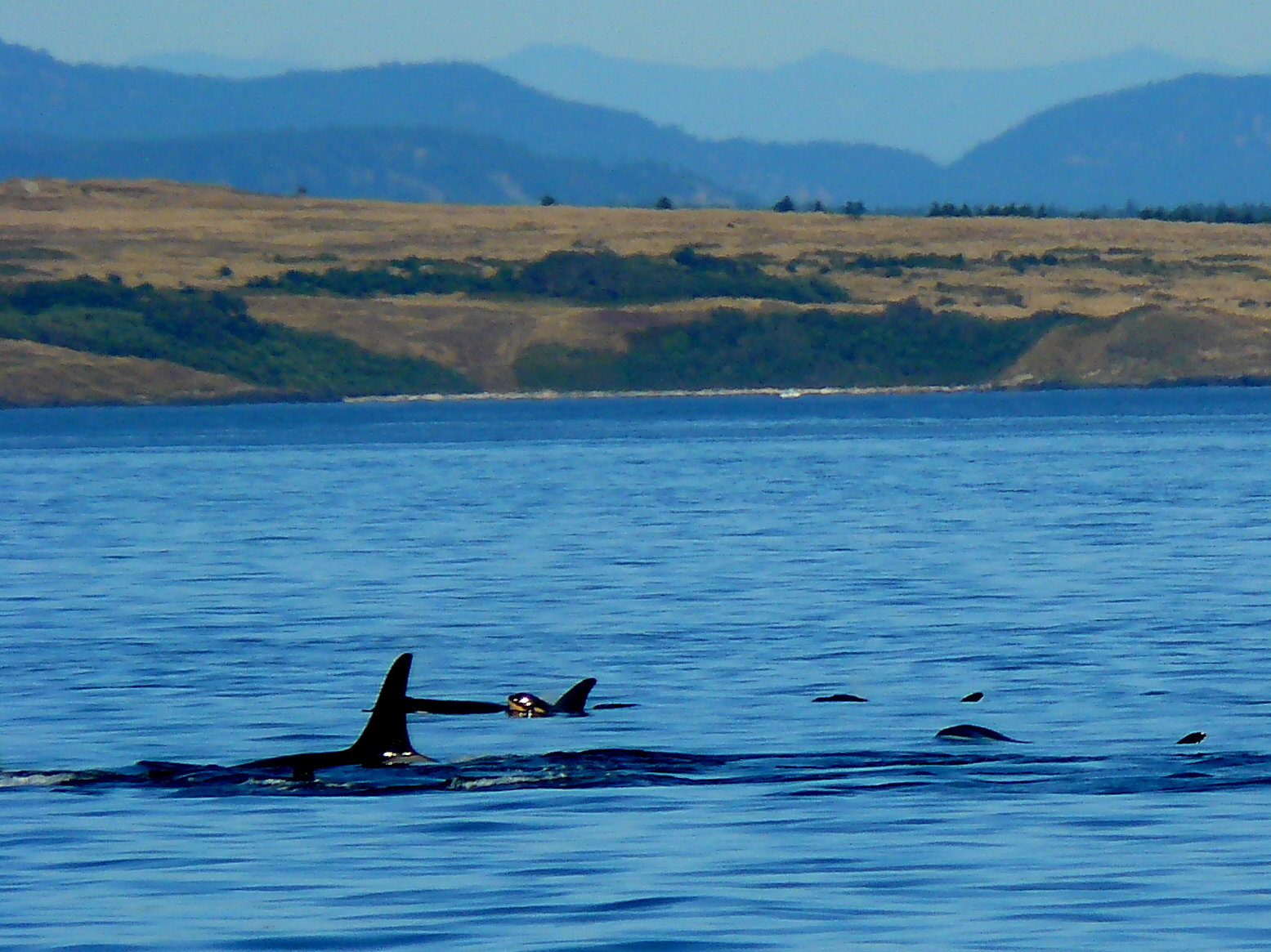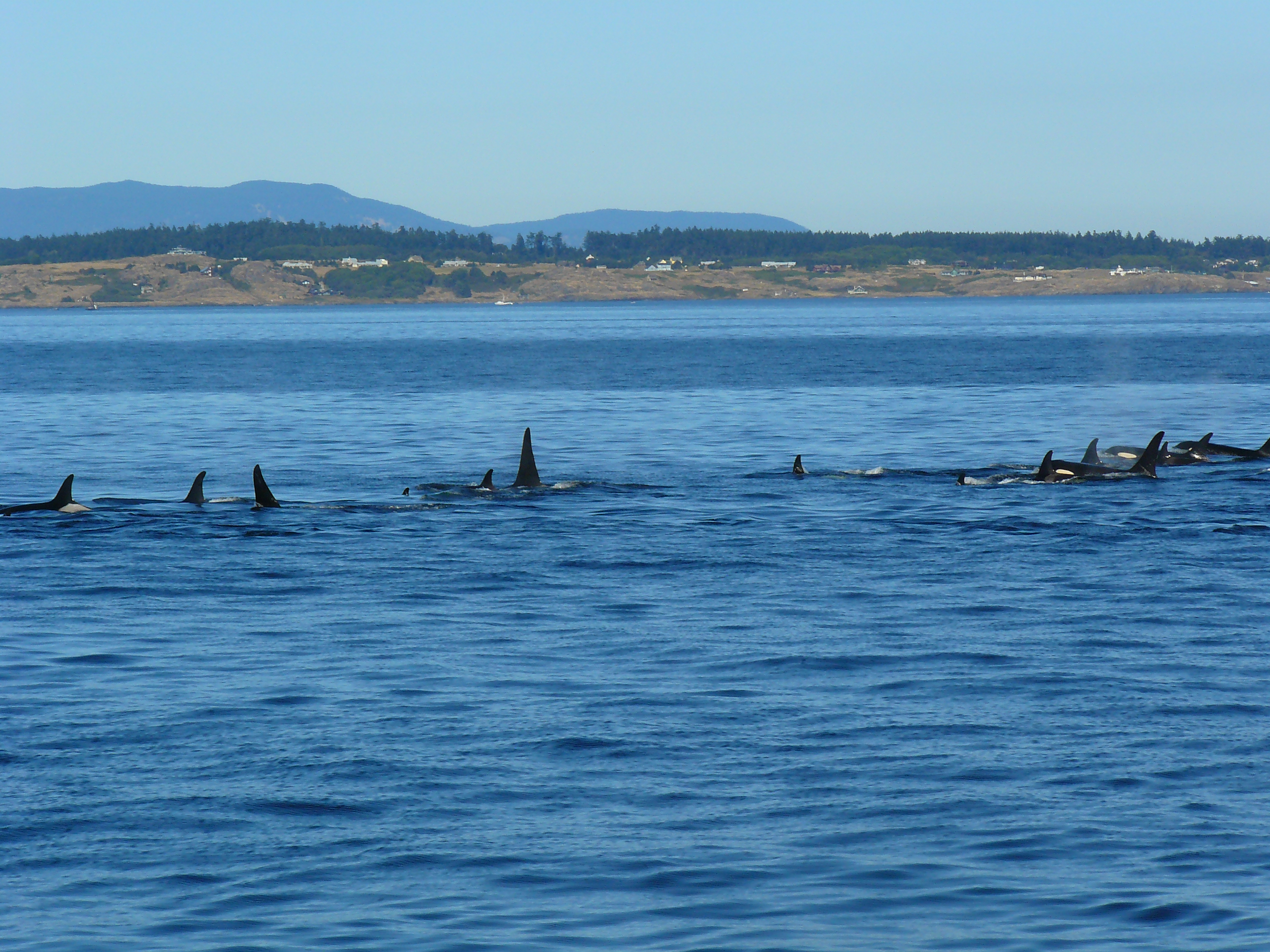 Resident Orcas had been out of our range, heading out to the Pacific Ocean, which is typical as their preferred prey, the summer Chinook Salmon finish their swims to spawning grounds and fall Chinook Salmon (hopefully) start coming into the Salish Sea. Today a beautiful experience, from 3:32pm to 4:30pm, to see 2 large groups of J-Pod, K-Pod, and orphan 19 year old L-87 Onyx! (He has been sighted with J-Pod for the last 2 seasons, so an honorary J-Podder now?!), I think it was also the warmest day of the year and we enjoyed the calm, glass like slack water, where the flooding, high tide had finished, then a mild ebbing, low tide, so not a lot of currents and good visibility. I wonder that the whales enjoyed it too, choosing to rest a bit, shoulder to shoulder, slowly swimming, zigzagging the area off of False Bay to Hein Bank in the Strait of Juan de Fuca. Hard to describe the magical encounter, hopefully the videos will share the moment!