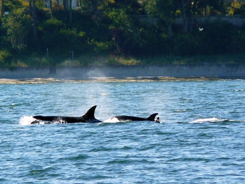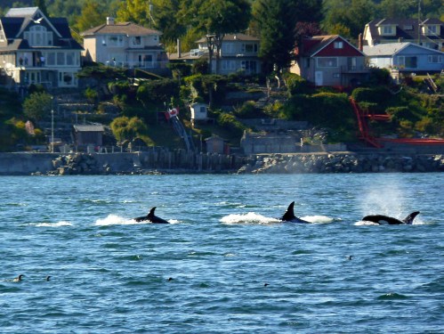 This sunny summer day took us to Vancouver Island, Canada to see 3 families of mammal eating killer whales heading south along the shoreline by D’Arcy Island, against a strong 7’ flooding-incoming tide. From about 3:50 to 4:25pm, we identified T036, 41 years old with her 13 year old T036B, her 21 year old daughter T036A, and 6 year old grandwhale T036A1! Also with them, T099, 27 years old with her 8 year old T099A and 4 year old T099B. At first they were traveling, so exciting to see these females and youngsters go into hunting mode. I saw a glimpse of a very small dorsal fin ahead, thinking at first it was the 4 year old. Then the whales quickly charged, changed directions, made exploding splashes, tail flukes in the air, ‘porpoise’- fast swimming and arching out of the water, tail-lobbing; fluke slapping the water (and prey?), I think it was a Harbor Porpoise they made a meal out of! I also noticed quite a few marine birds and gulls in the area, perhaps waiting for leftovers!