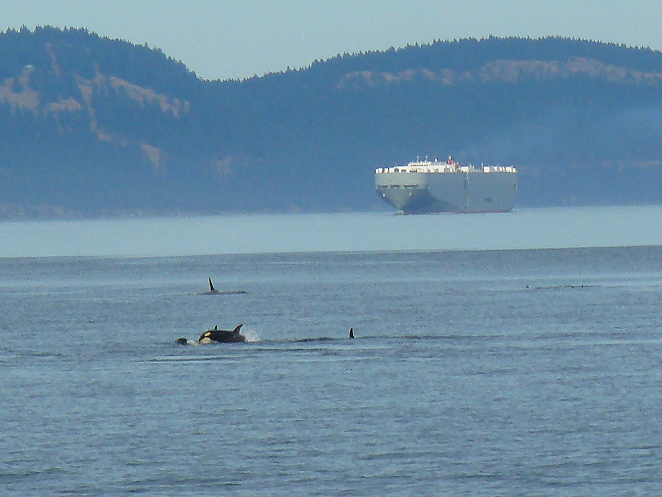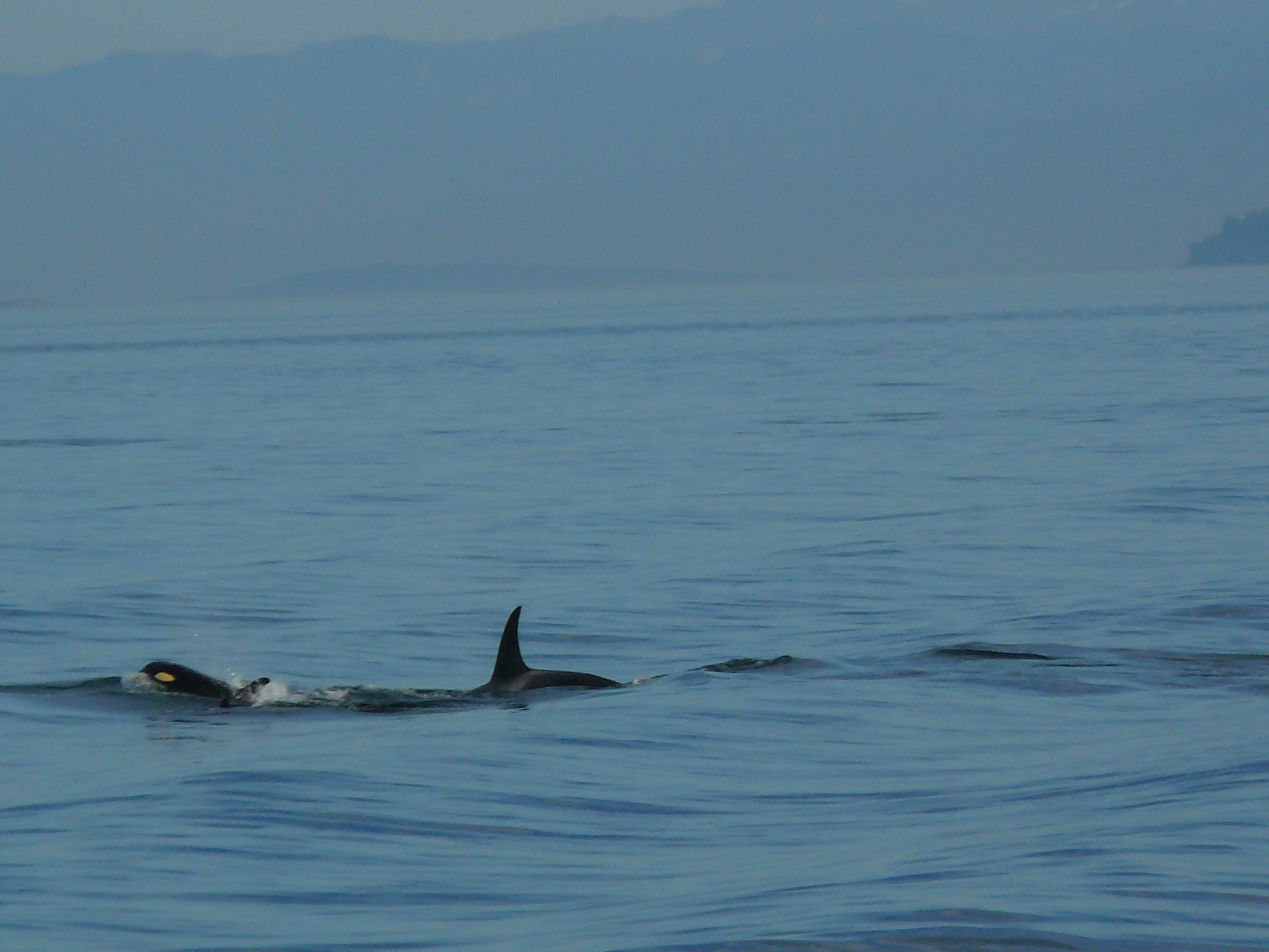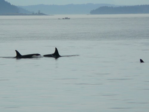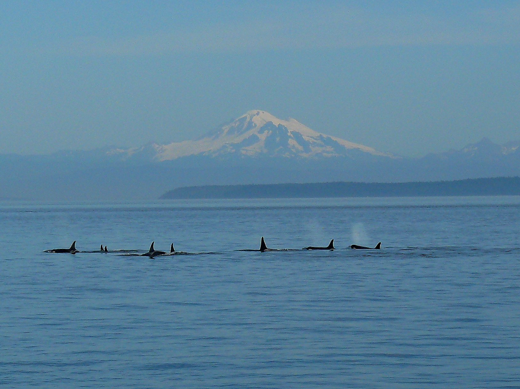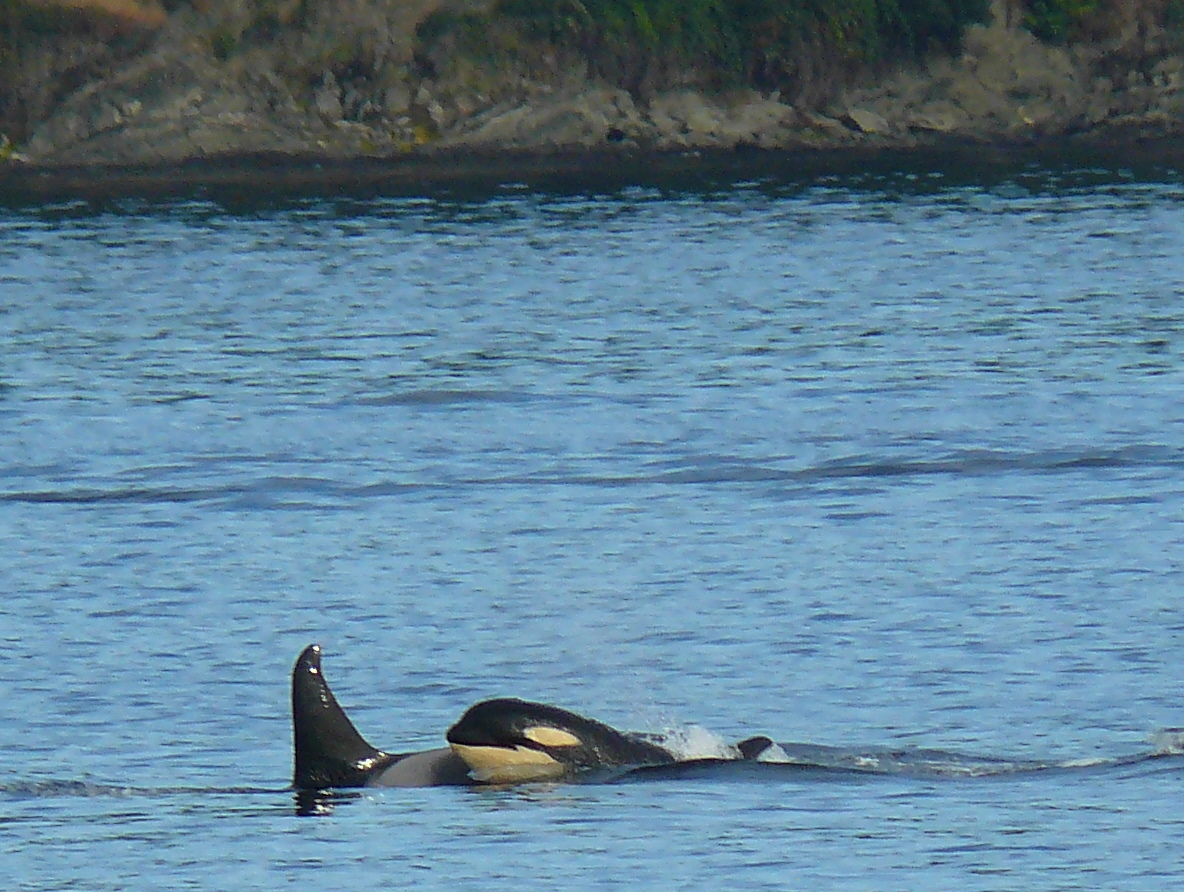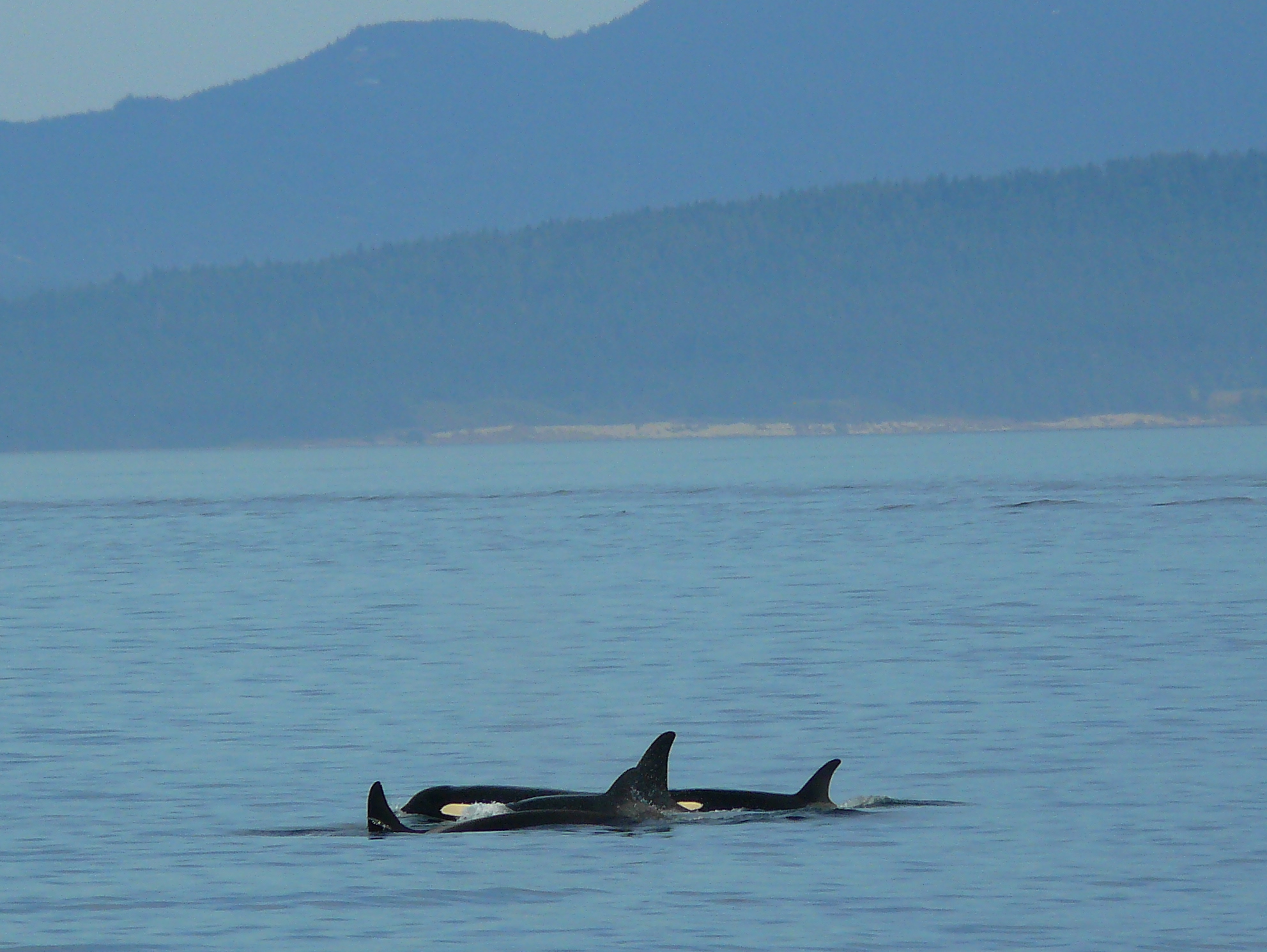 Another wondrous, memorable trip out into the Salish Sea! Calm, clear waters, like a pond with a minimal ebbing tide. More sun and many, 50+? whales heading northwest from about 3:15pm to 4:30pm, past Spieden and Stuart Islands. J-Pod and L-Pod Orcas spread out, some males further out in Haro Strait, while females with youngsters closer to shore. L-55 with the newest calf L-118 and the rest of her family were the trailing group, so they sped swam- ‘porpoised’ to catch up! All the groups gathered together as they had to decide which way to go at Turn Point. I guessed they were going to turn right, into Boundary Pass, and sure enough they did! L-Podders don’t go the other way through Active Pass, as much as J-Podders do. They spread out again, heading toward Saturna Island, surfing the wake of a large cargo ship, and a parting breach. Breathtaking to see the whales and waters, island and mountain backgrounds.