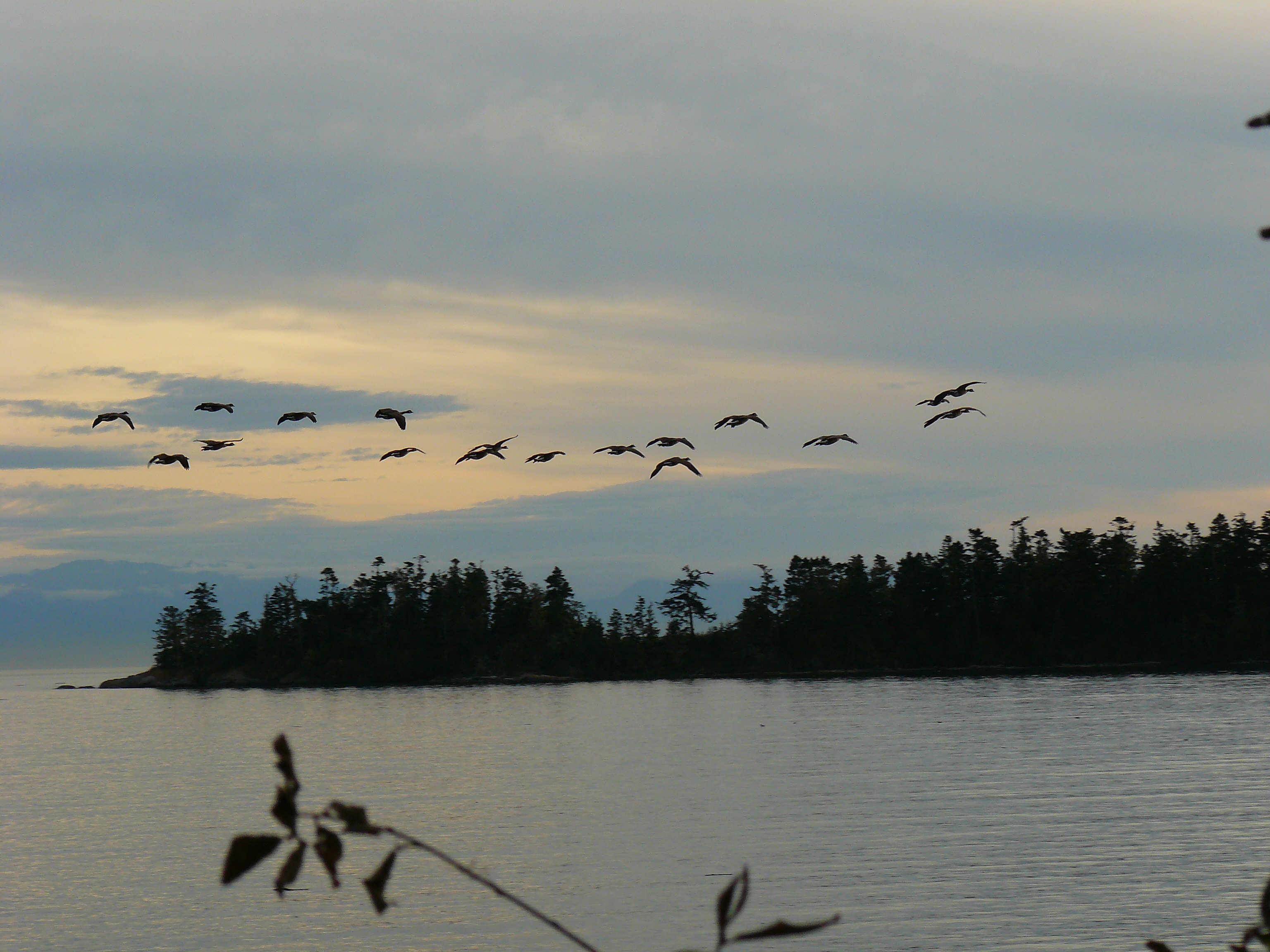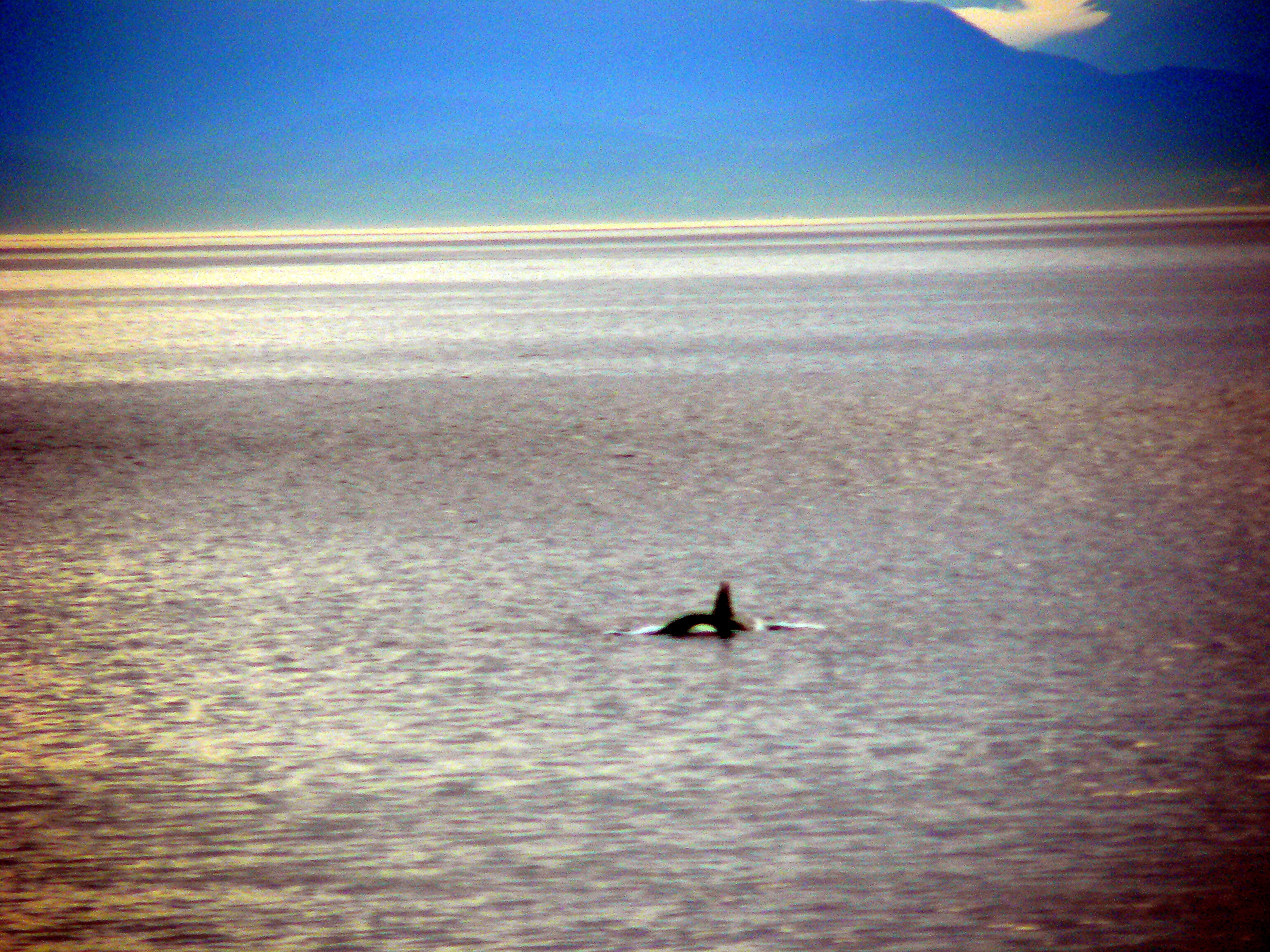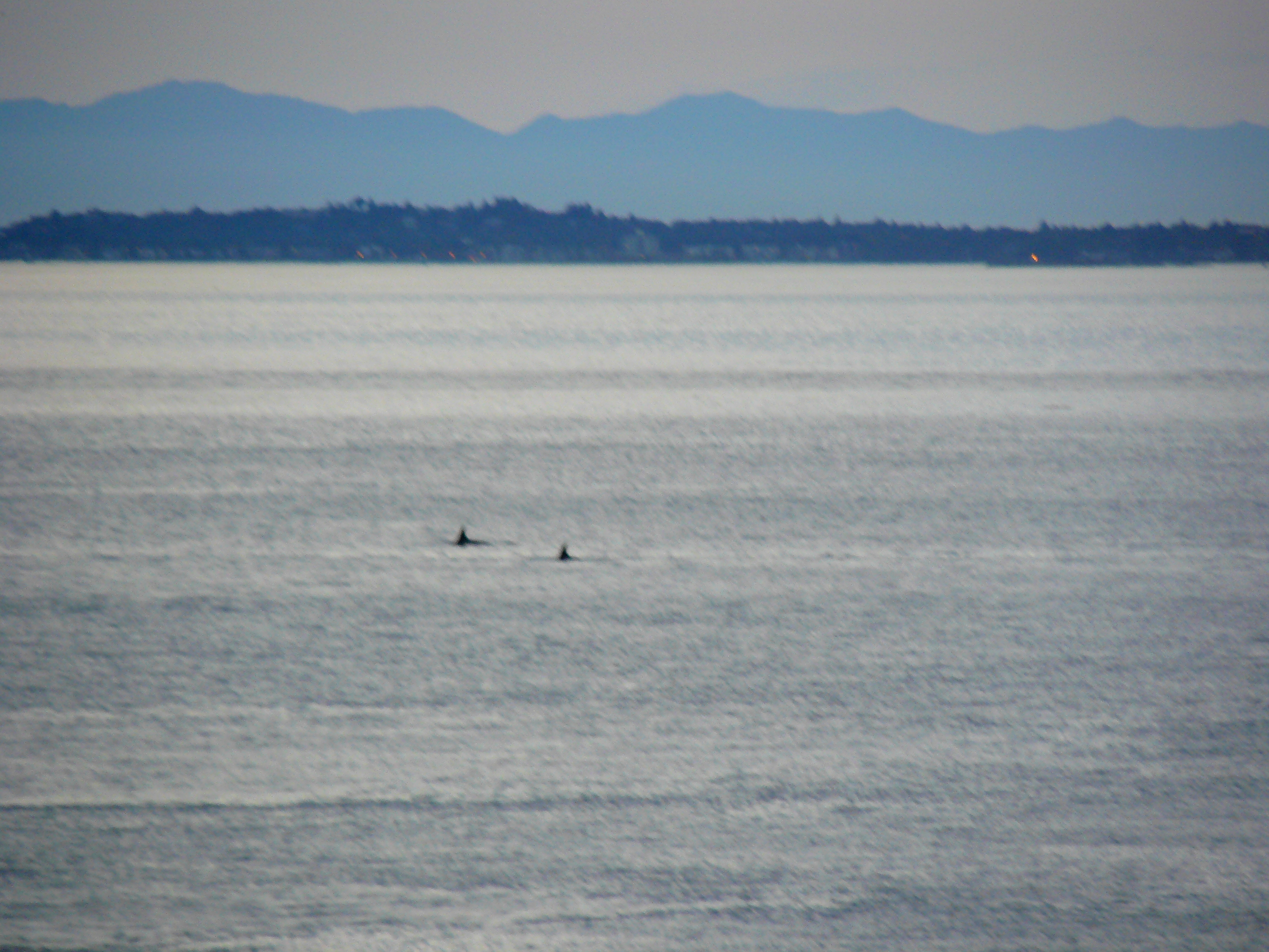 Autumn has arrived, we’ve had a gale come through, yet the whales are still here looking for salmon! They had been in the Strait of Juan de Fuca, so I checked the tides and saw a strong 8.6 flooding tide, peaking around 6:30pm. I thought if they were going to stay in the Salish Sea, they would take advantage of the last of the currents to head up Haro Strait. I drove (by car) to the San Juan Island Westside Land Preserve at about 5:45pm, no Orcas, so I headed south to see if they were still milling about. Pulling over at False Bay, I spotted a trailing group of whales heading northwest! So I went back to the Hannah Heights area at 6:30pm, delighted to see the Killer Whales all spread in small groups, out in Haro Strait traveling northwest. After awhile I noticed a female with 2 youngsters stopped, just logging-resting at the surface. Then the whales up north turned and swam back, rejoining the other groups. I wonder if that female was a matriarch deciding they were going back south, enjoying the slack water, utilizing the ebbing tide?! The sun had set, light fading, 7:30pm now, yet I stayed until I couldn’t hear their strong breaths anymore. They were going out of sight and sound, time for me to go home too!