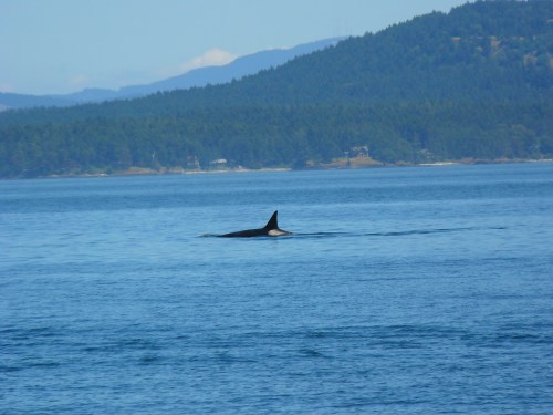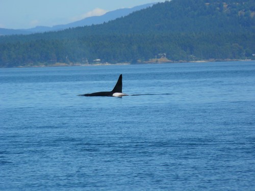 Monday June 11, 2012. I wonder if the whales have territorial agreements? We don’t often sight the different ecotypes of Orcas-Killer Whales in the same area, at the same time. Since SRKW- Orcas were out of our range, I wasn’t surprised to hear Bigg’s Transient Killer Whales were by the D’Arcy Islands at Vancouver Island, Canada. We went for the international tour! T-020, a 49 year old male was with his 44 year old sister, T-021. They were quiet and traveling slowly, appearing to be resting at times, with the 2.5’ flooding tide. We did see a Harbor Seal in the area, and very few Harbor Porpoise, but no obvious meals consumed. These whales have managed to share their entire long lives, at times surfacing together, shoulder to shoulder, a beautiful sight!