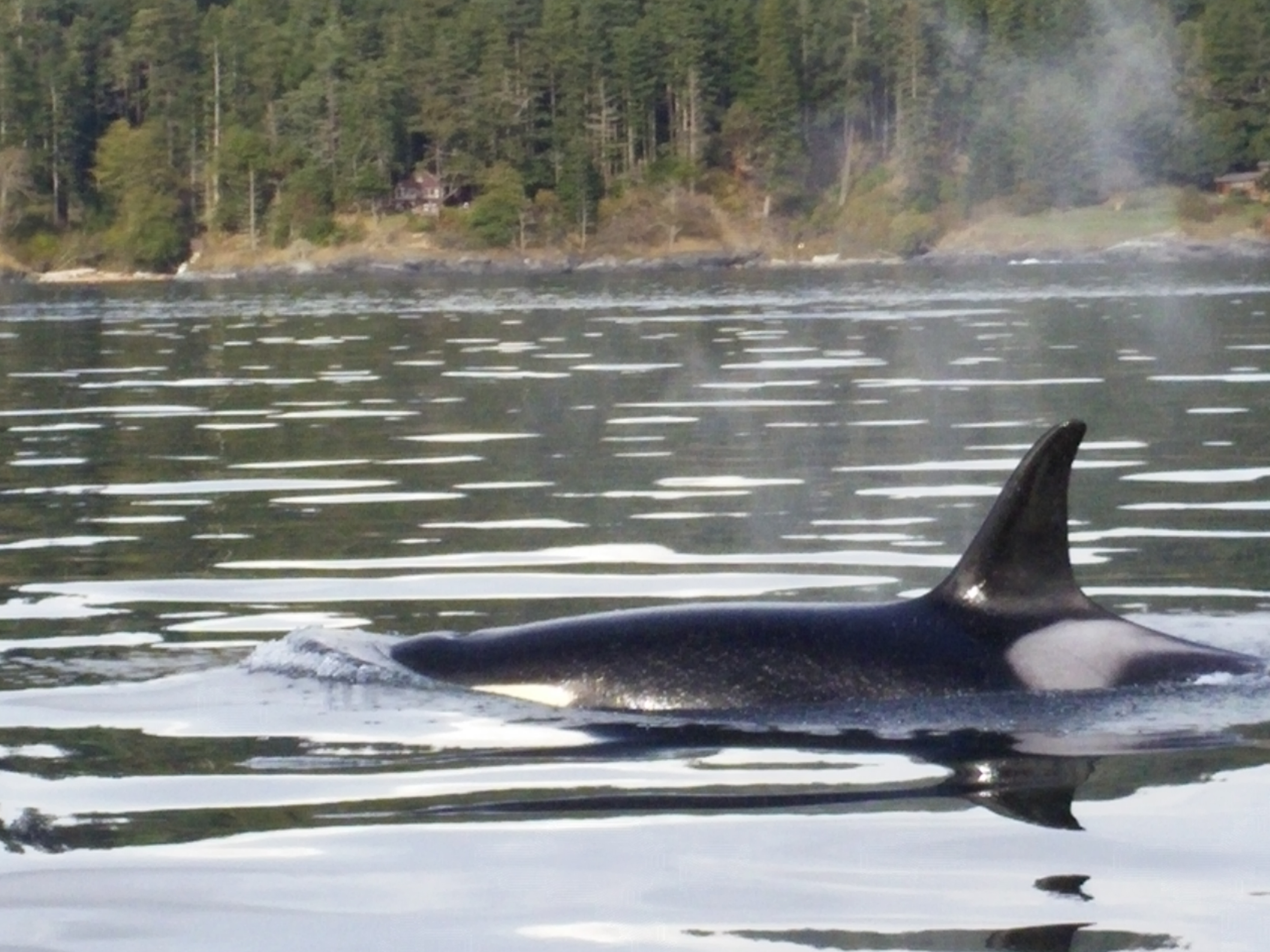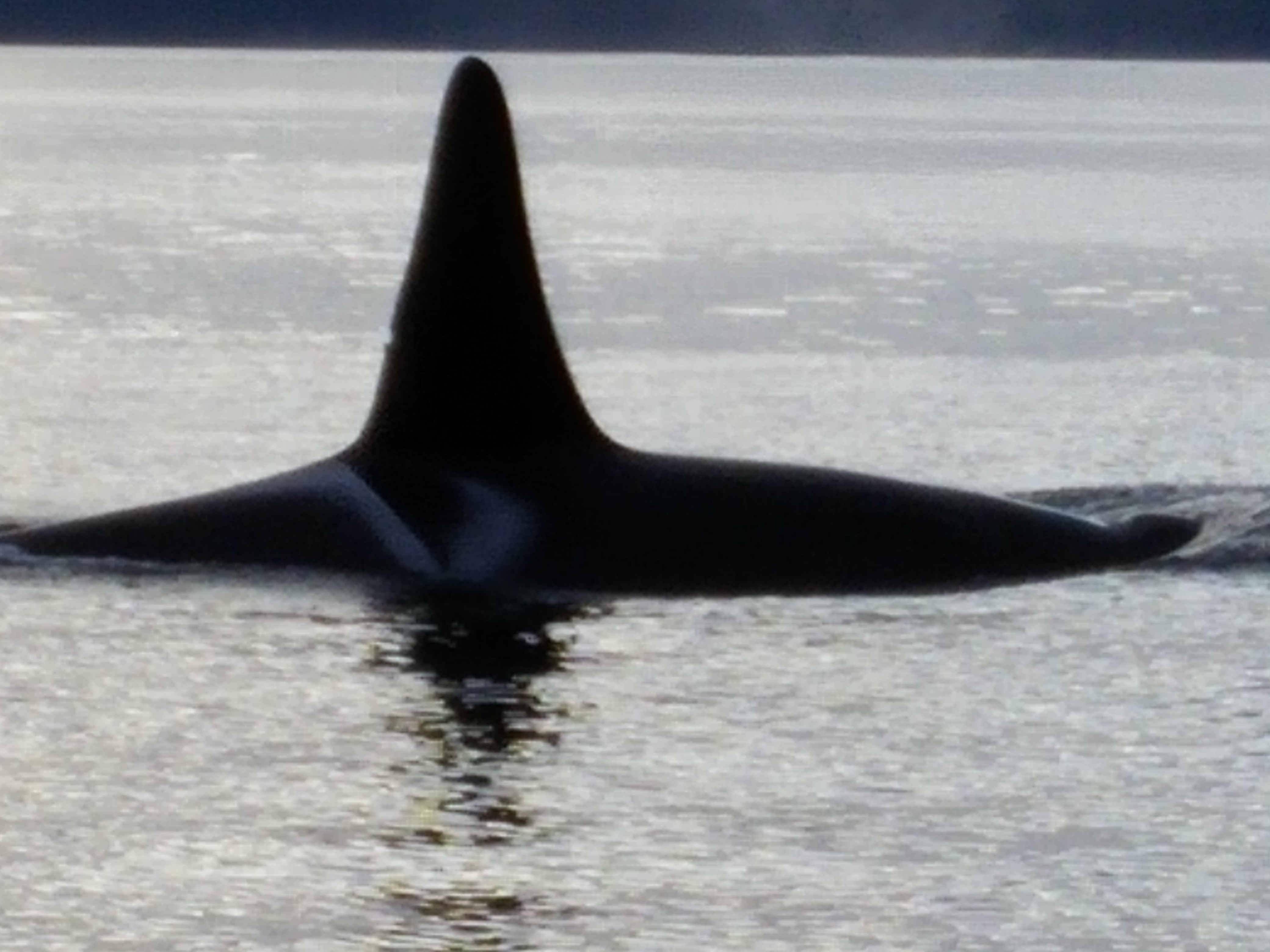 The Orcas were spread out from Eagle Point heading west and north. The first group and whale we see is L-86 Surprise with her son and relatives, but sadly no baby L-120, confirming the loss.