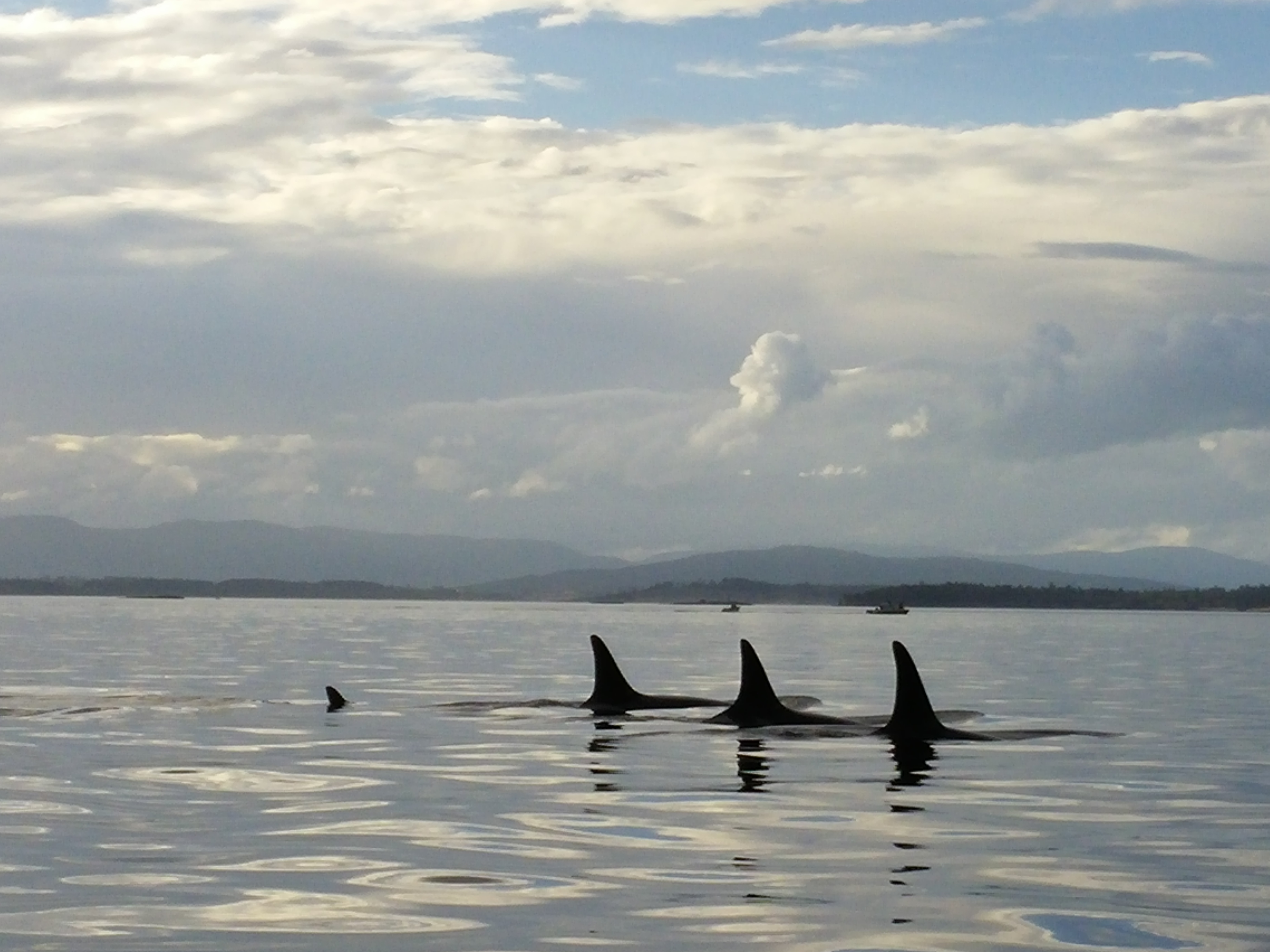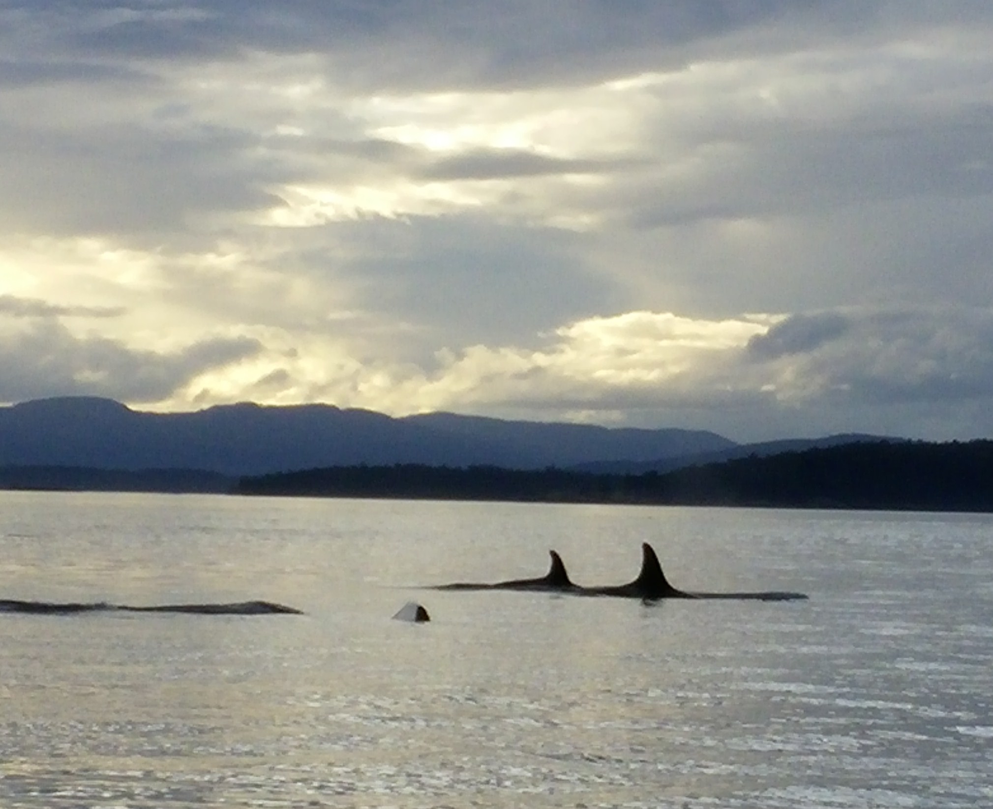 Timing is important and does work out sometimes. I was helping out at the Center for Whale Research when we heard L-Pod whales were sighted in the Strait of Juan de Fuca. Ken Balcomb, Erin Heydenreich, and I headed out to take photo identification, location, and behavioral data. The rain stopped and gave us two and a half dry hours. I was a very enthused passenger taking videos and photos with my smartphone.
