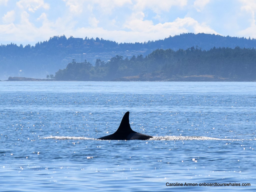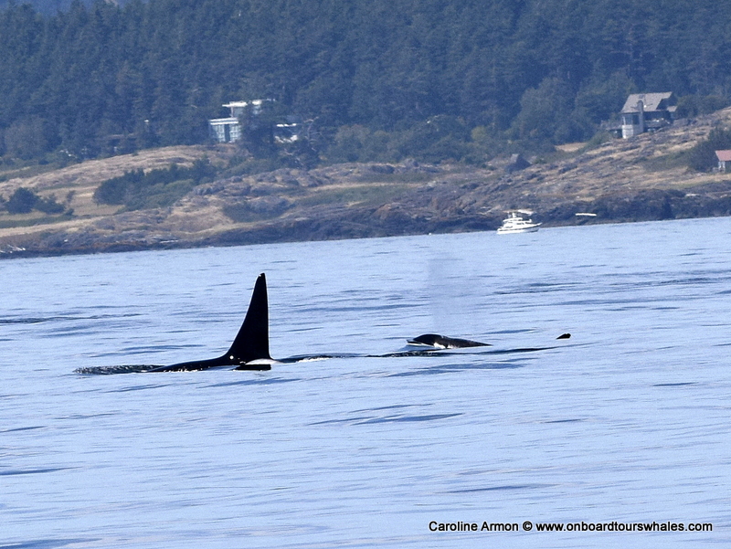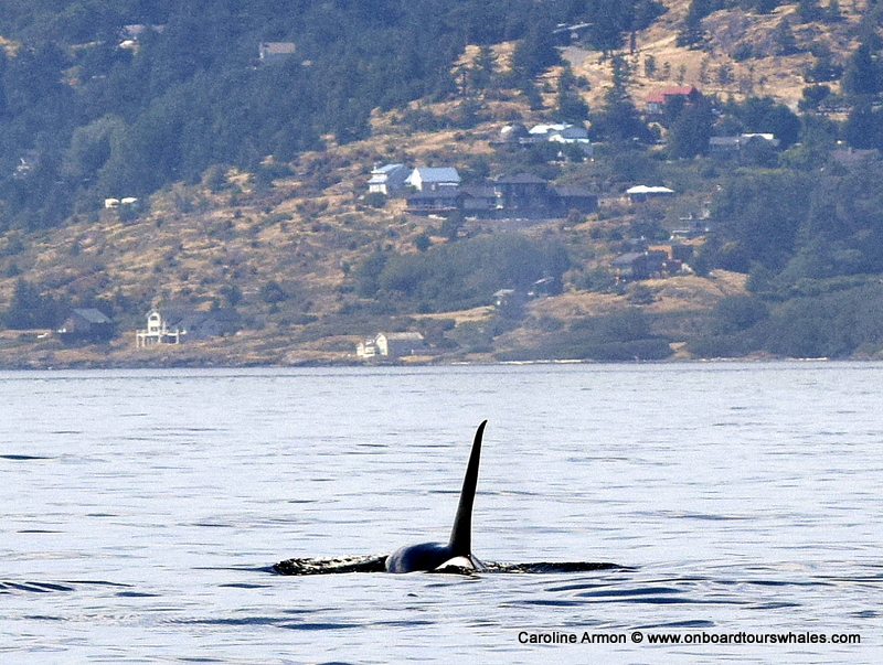 July 31, 2019 Serendipity brought the Transient-Bigg’s killer whale family of T46B1’s swimming with the last of a strong new moon 10′ flooding tide, foraging nearshore for seals and porpoises along the westside of San Juan Island.