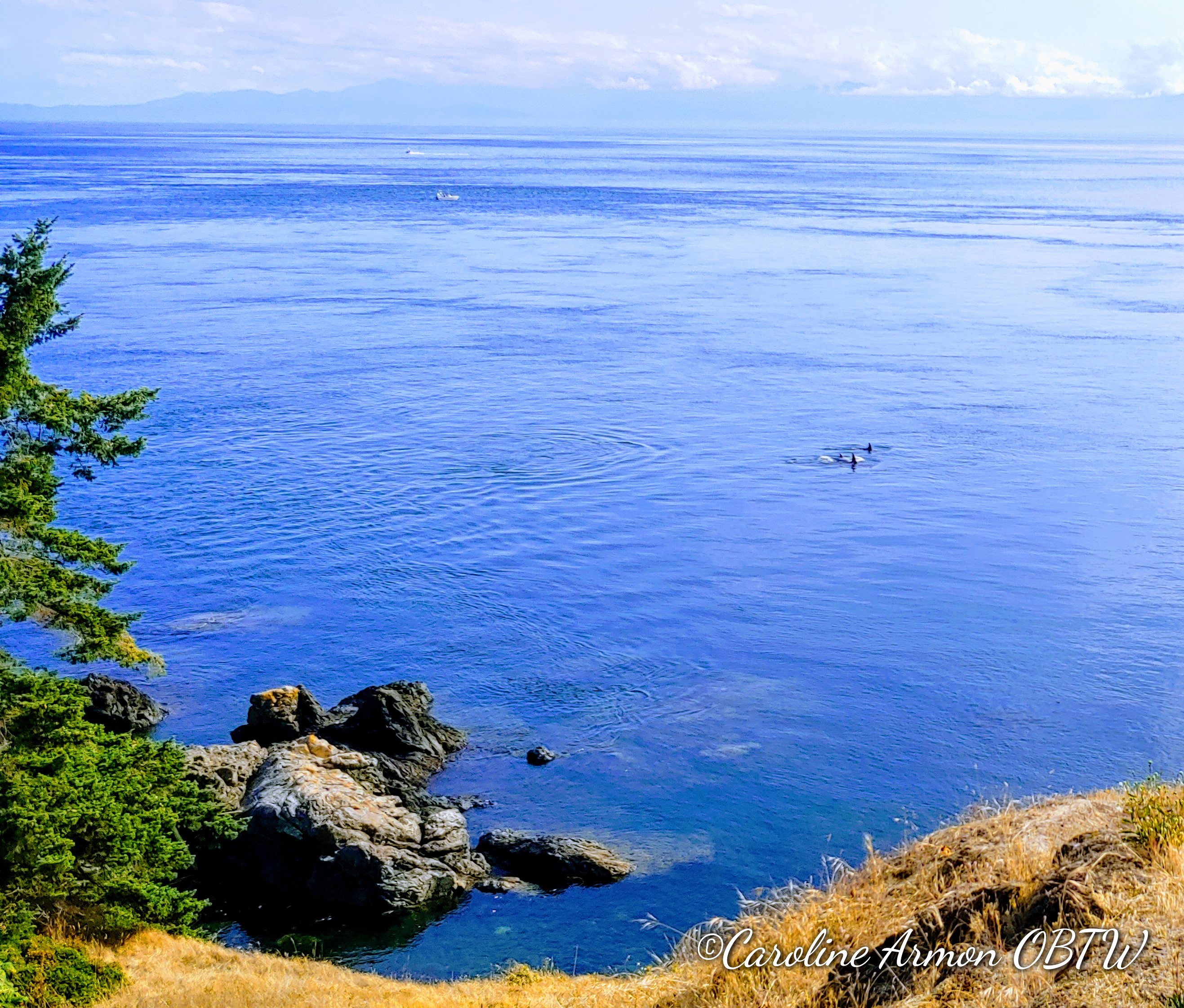 We are all overcome with joy to see Southern Resident J pod and K pod orca families, who many of us consider part of our families, do the ‘Westside Waltz’ swimming back and forth throughout the days along the Westside of San Juan Island during Independence Day weekend! It filled my heart to see, and hear the powerful breaths of these sentient beings, and that they were doing the ‘dance’ we had not seen in a very long time. When I arrived to the Westside Saturday afternoon, some of the orca families were already down by the south end of the island, so I can’t help but wonder if their ‘porpoising’ high speed swimming shown in my photos was in response to a call from the others saying we found some salmon, or it’s time to go look for salmon elsewhere… Their synchronicity really struck me too. We need to synchronize, work together as these beloved, extraordinary creatures do.